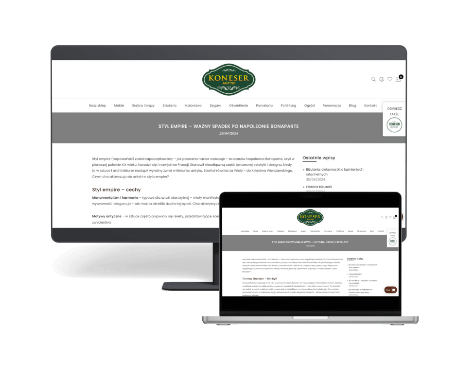 Teksty blogowe od lutego do maja 2024 roku, np. „Styl art déco – wszystko, co warto o nim wiedzieć”, „Dlaczego warto kupować meble antyczne?”, „Czym charakteryzuje się styl biedermeier?”, „Styl Ludwika Filipa – co warto o nim wiedzieć?”.