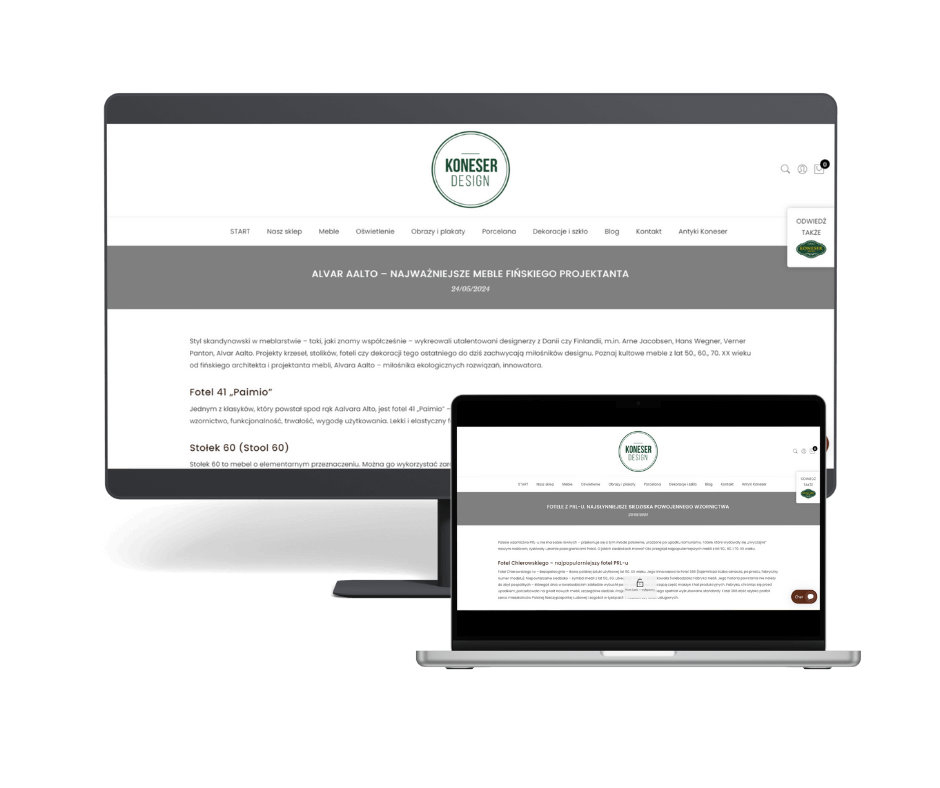 Teksty blogowe od lutego do maja 2024 roku, np. „Styl skandynawski w meblarstwie – jak rozsławił się na świecie?”, „Prostota, funkcjonalność i harmonia. Jacy są najważniejsi reprezentanci duńskiego designu?”, „Fotele z PRL-u. Najsłynniejsze siedziska powojennego wzornictwa”, „Meble z okresu PRL – dlaczego do nich wracamy?”.