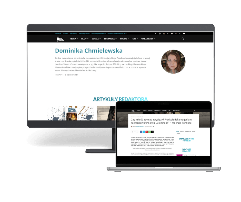 Recenzje i felietony dotyczące popkultury. Pisałam o książkach, komiksach, mangach, serialach i k-dramach, grach komputerowych i planszowych, relacjach z festiwali filmowych. Współpraca barterowa.