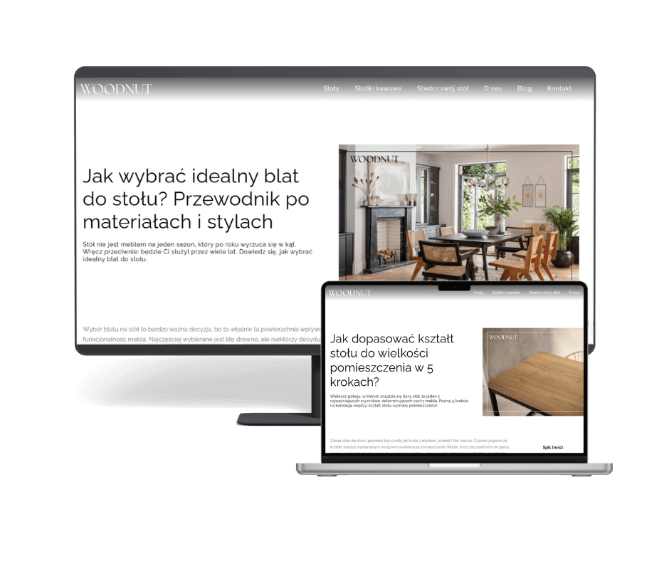Wiele tekstów blogowych w I połowie 2025 roku, m.in. „Wybór stołu do kawalerki. Jak wybrać idealny model dla siebie?”, „Jak dopasować kształt stołu do wielkości pomieszczenia w 5 krokach”, „Dlaczego stoły z litego drewna są ponadczasowym wyborem?”.